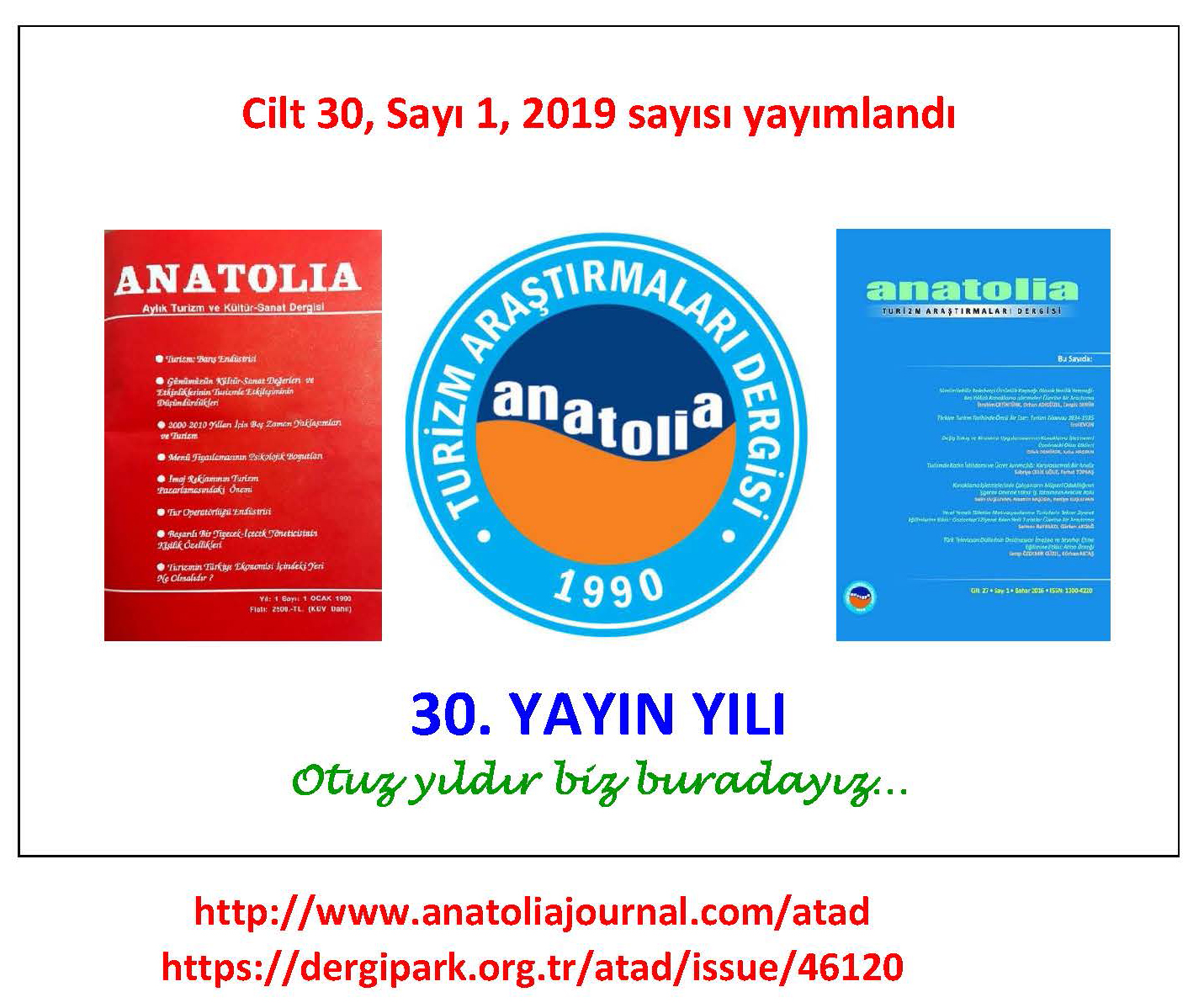 Anatolia: Turizm Araştırmaları Dergisi 30 yaşında! Ülkemizde turizm alanında en uzun süreli yayımlanan dergisi olan Anatolia: Turizm Araştırmaları Dergisi'nin yeni sayısı (Cilt 30, Sayı 1, Bahar 2019) geçtiğimiz günlerde yayımlandı. Derginin yeni sayısında yedi makale, rekreasyon araştırmaları, kitap tanıtımı, etkinlik notları ve araştırma projelerine ilişkin yazılar yer alıyor. Ayrıntılı bilgi için bkz.