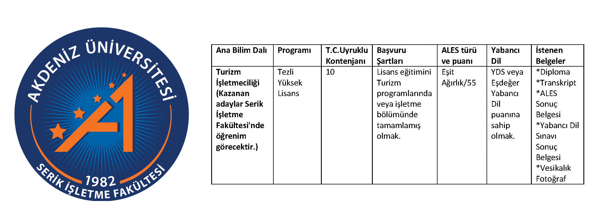 Akdeniz Üniversitesi Serik İşletme Fakültesi Turizm İşletmeciliği anabilim dalına yüksek lisans öğrencisi alınıyor Akdeniz Üniversitesi Serik İşletme Fakültesi'nde Turizm İşletmeciliği ABD bünyesinde 2019-2020 Eğitim Öğretim Yılı Güz Yarıyılı'nda lisansüstü öğrenci alımına başlanıyor. Akdeniz Üniversitesi Sosyal Bilimler Enstitüsü 2019-2020 Eğitim Öğretim Yılı Güz Yarıyılı lisansüstü öğrenci alım ilanı en geç 12 Temmuz'da yayınlanacak olup, ONLINE başvurular 16 Temmuz 2019 tarihinde başlayıp 09 Ağustos 2019 tarihinde sona eriyor.