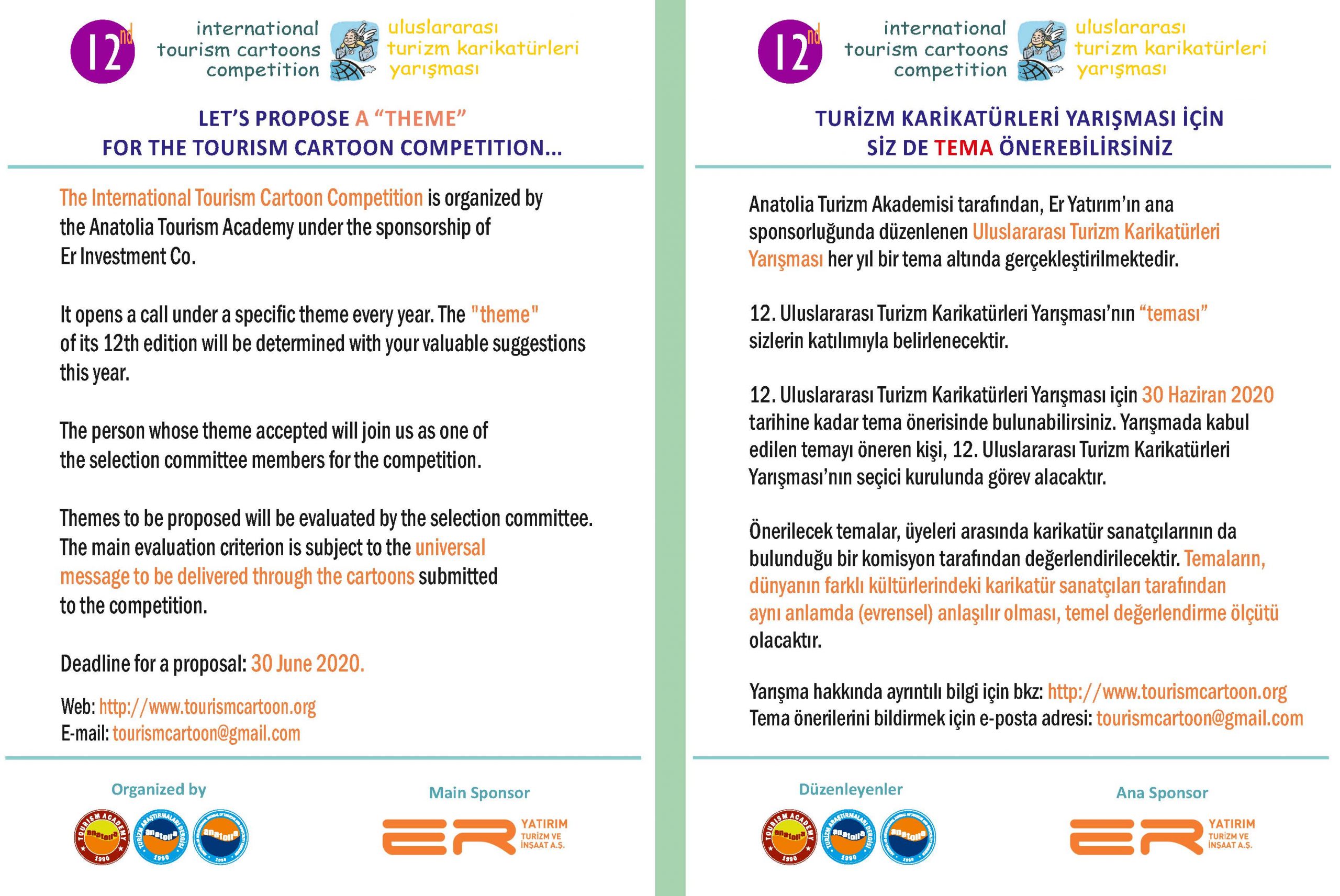 Karikatürcüler Coronovirus'ün Turizm Sektörüne Etkilerini Çizecekler Anatolia Turizm Akademisi tarafından Er Yatırım'ın ana sponsorluğunda düzenlenen 12'inci Uluslararası Turizm Karikatürleri Yarışması'nın teması belli oldu. Turizmle ilgili bir alt tema belirlenerek düzenlenen yarışmada, bu yıl yapılan tema belirleme anketine 13 farklı ülkeden 42 kişi katılarak, toplam 84 tema önerdi. Önerilen temalar arasından 1) Koronavirus Günlerinde Turizm, 2) Koronavirus Sonrası Turizm, 3) Turizmde Sosyal Mesafe yarışma teması olarak kabul edildi. 2009 yılından bu yana her yıl geleneksel olarak düzenlenen yarışma, dünya genelinde alanındaki tek karikatür yarışması olarak biliniyor. “Yetişkinler” ve “Gençler” olmak üzere iki kategoride düzenlenen yarışmada; 16 ve daha alt yaş grubundakiler “Gençler” kategorisine, 17 ve üst yaşlardaki karikatürcüler de “Yetişkinler” kategorisine eser gönderebiliyor. “Yetişkinler” kategorisinde birincilik, ikincilik ve üçüncülük ödüllerine ek olarak, Uluslararası Turizm Karikatürleri Yarışması'nın başlatıcılarından Prof. Atila Özer adına da özel ödül veriliyor. “Gençler” kategorisinde ise birincilik, ikincilik ve üçüncülük olmak üzere üç ödül yer alıyor. Yarışmada dereceye girenlere para ödülünün yanı sıra tatil ödülü de veriliyor.