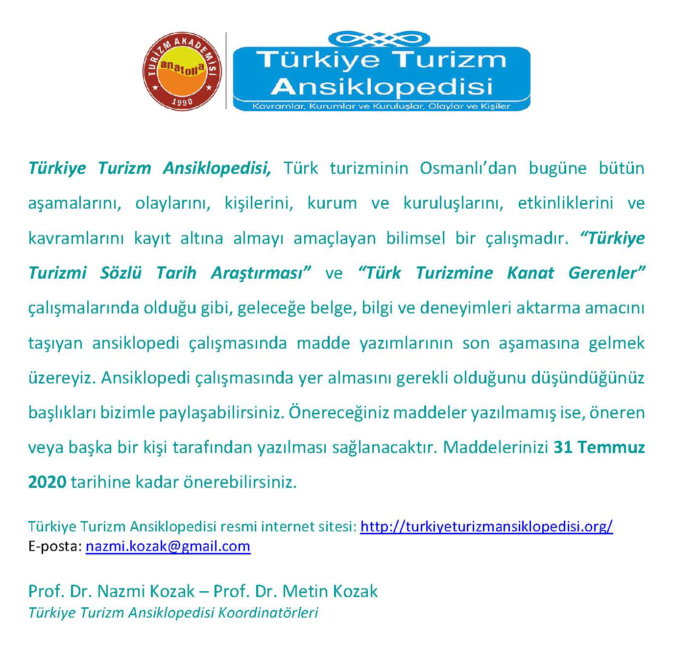 31 Temmuz 2020 tarihine kadar yeni madde önerebilirsiniz. Türkiye Turizm Ansiklopedisi, Türk turizminin Osmanlı'dan bugüne bütün aşamalarını, olaylarını, kişilerini, kurum ve kuruluşlarını, etkinliklerini ve kavramlarını kayıt altına almayı amaçlayan bilimsel bir çalışmadır. “Türkiye Turizmi Sözlü Tarih Araştırması” ve “Türk Turizmine Kanat Gerenler” çalışmalarında olduğu gibi, geleceğe belge, bilgi ve deneyimleri aktarma amacını taşıyan ansiklopedi çalışmasında madde yazımlarının son aşamasına gelmek üzereyiz. Ansiklopedi çalışmasında yer almasını gerekli olduğunu düşündüğünüz başlıkları bizimle paylaşabilirsiniz. Önereceğiniz maddeler yazılmamış ise, öneren veya başka bir kişi tarafından yazılması sağlanacaktır. Maddelerinizi 31 Temmuz 2020 tarihine kadar önerebilirsiniz. Türkiye Turizm Ansiklopedisi resmi internet sitesi: http://turkiyeturizmansiklopedisi.org/ E-posta: [email protected] Prof. Dr. Nazmi Kozak – Prof. Dr. Metin Kozak Türkiye Turizm Ansiklopedisi Koordinatörleri