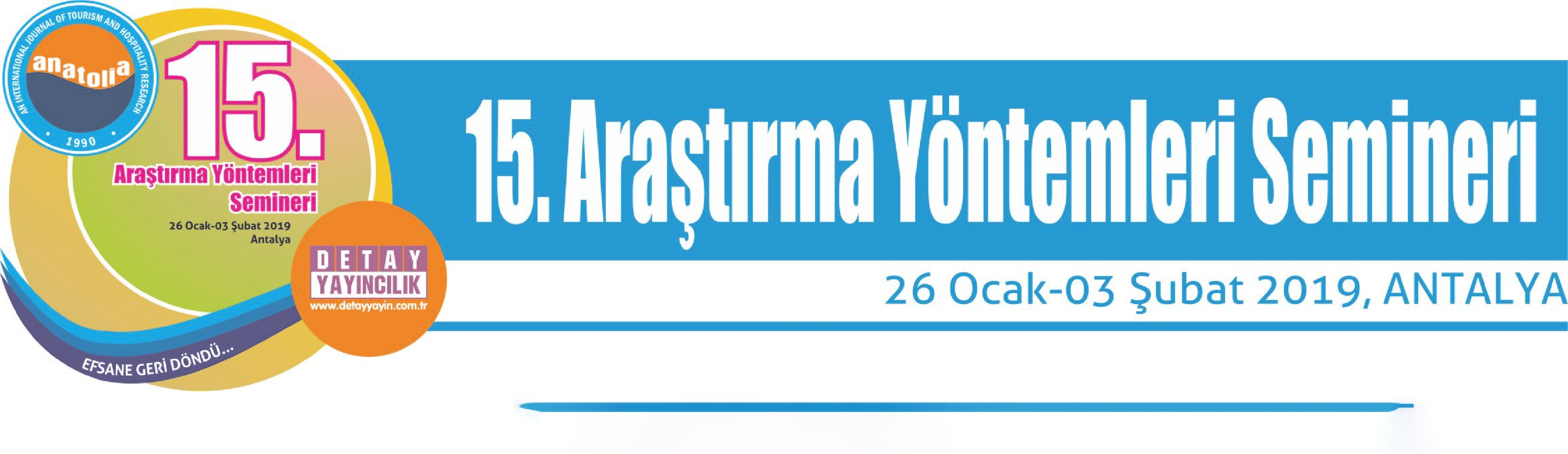15. Araştırma Yöntemleri Semineri 26 Ocak - 3 Şubat 2019 tarihlerinde Antalya'da yapılıyor Alanında dünyanın ve Türkiye'nin en kapsamlı Araştırma Yöntemleri Semineri'nin 15'incisi 26 Ocak - 3 Şubat 2019 tarihleri arasında Antalya'nın Kemar ilçesinde faaliyet gösteren Mirage Park Resort'te düzenleniyor. İki dönem olarak toplam 16 seminerin yer aldığı 15. Araştırma Yöntemleri Semineri için ayrıntılı bilgi almak için tıklayınız.