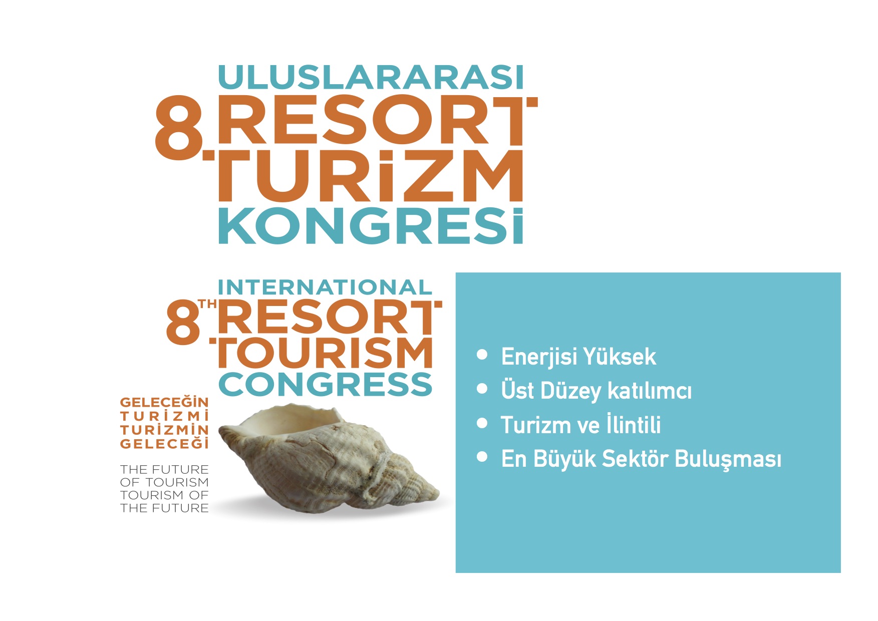 8. Uluslararası RESORT Turizm Kongresi Turizm ve turizm ilintili sektör temsilcilerinin katıldığı 8. Uluslararası RESORT Turizm Kongresi kayıtları başladı. Kongre 28-29 Kasım 2018 tarihlerinde Antalya'da gerçekleşecek. Organizasyona kamu ve özel sektörden 1000'i aşkın katılımcı bekleniyor. Ayrıntılı bilgi için bkz.