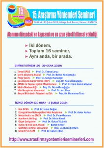 15. Araştırma Yöntemleri Semineri başvuruları 7 Ocak'ta sona eriyor... Dünyanın en kapsamlı ve en uzun süreli bilimsel araştırma yöntemleri semineri olan araştırma yöntemleri seminerler serisinin 15'incisi 26 Ocak - 03 Şubat 2019 tarihleri arasında Antalya'da yapılıyor. İki dönem halinde ve 16 seminer konusunda oluşan seminerlere 07 Ocak 2019 tarihine kadar başvuru yapılabiliyor. Ayrıntılı bilgi için bkz.