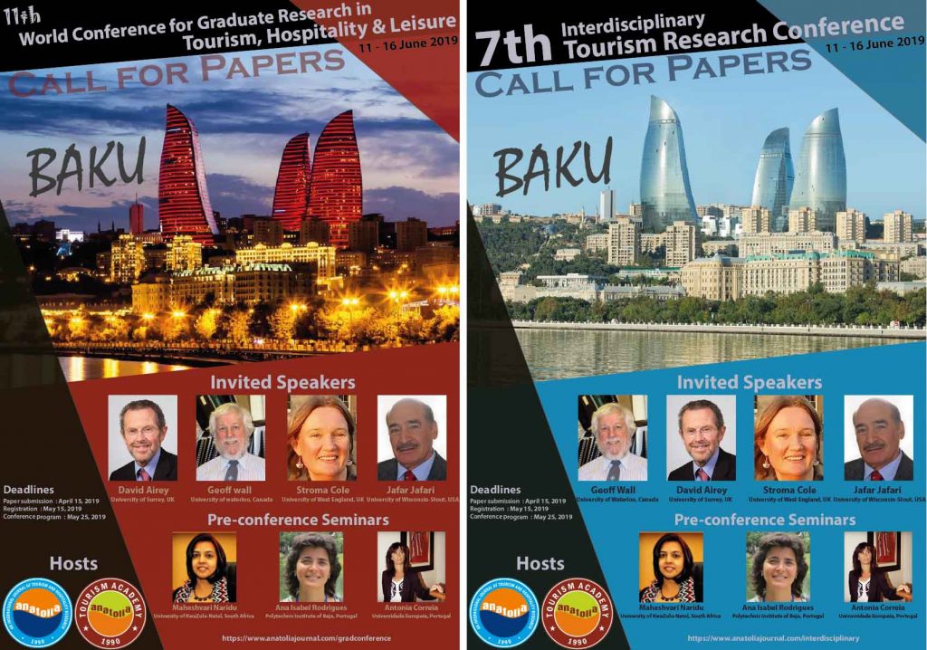 Uluslararası Anatolia Kongreleri Azerbaycan'ın başkenti Bakü'de yapılıyor... Anatolia Turizm Kongreleri bu yıl 11-16 Naziran 2019 tarihlerinde Azerbaycan'ın başkenti Bakü'de yapılıyor. Ayrıntılı bilgi için bkz; 11th World Conference for Graduate Research in Tourism Hospitality and Leisure: http://anatoliajournal.com/gradconference 7th Interdisciplinary Tourism Research Conference: http://anatoliajournal.com/interdisciplinary